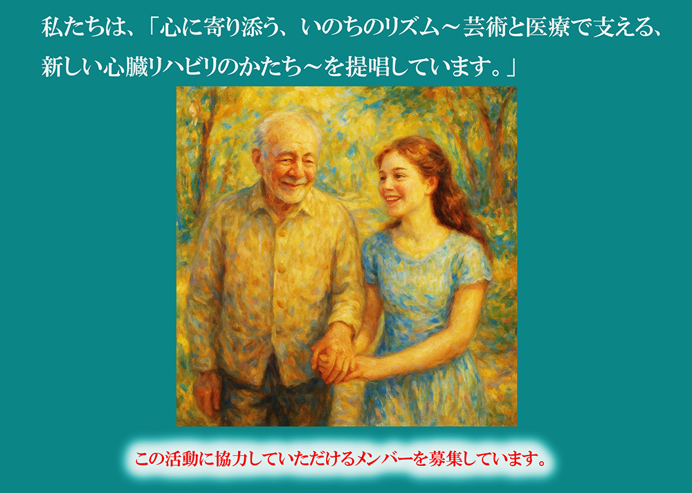 心不全の患者さんに向けての「心の癒し」として「唱歌へのいざない」という絵本を制作しました。 すでに、いくつかの施設から、その素晴らしい効果が認められた報告が寄せられています。